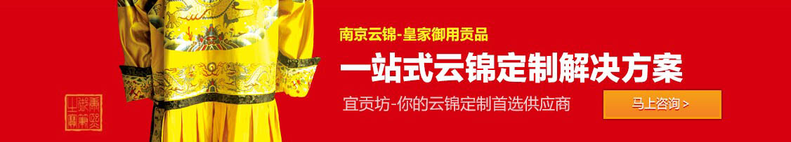 南京宜貢坊云錦文化科技有限公司成立于二OO一年,場地面積10000㎡,致力于做中國知名的云錦,宜貢坊云錦文化科技有限公司座落于江寧開發區。做為江蘇云錦文化科技品牌之一,南京宜貢坊擁有雄厚的技術力量和實力,現有大型傳統花木樓織機幾十臺,織造師、研究設計人員數百人。公司擁有直屬北京、深圳、上海辦事處和近千家緊密經銷商、合作商;產品在南京中央商場、新百、上海八百伴、上海友誼商場,泰州金鷹等全國多家大型商場均有專柜。